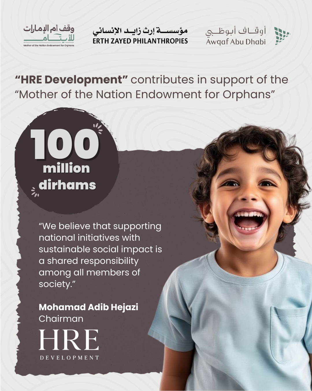 HRE Development has contributed AED 100 million in support of the “Mother of the Nation Endowment for Orphans” campaign, launched by the Endowments and Minors’ Funds Authority – Awqaf Abu Dhabi under the patronage of His Highness Sheikh Mohamed bin Zayed Al Nahyan, President of the UAE. The contribution comes amid growing participation from individuals