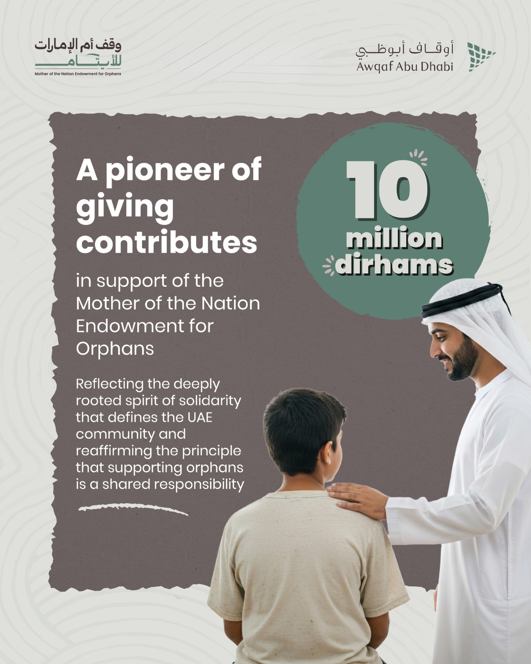 A pioneer of giving has contributed AED 10 million to the “Mother of the Nation Endowment for Orphans” initiative, launched by the Endowments and Minors’ Funds Authority – Awqaf Abu Dhabi under the patronage of His Highness Sheikh Mohamed bin Zayed Al Nahyan, President of the UAE. The initiativeaims to establish a sustainable endowment (waqf)