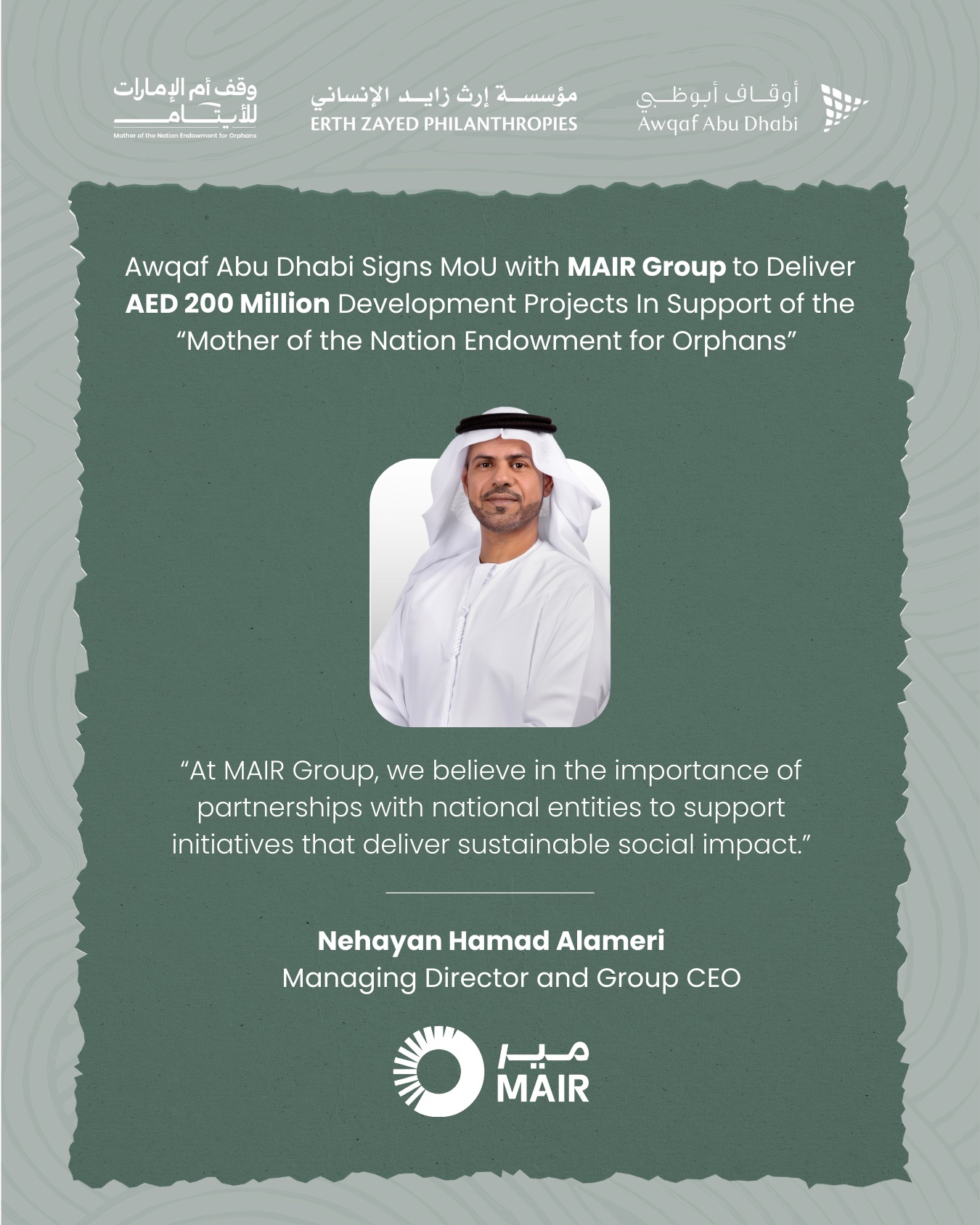 Emirati BusinessmanMohmmed Alsayyahhas contributed AED 100 million in support of the “Mother of the Nation Endowment for Orphans” campaign, launched by the Endowments and Minors’ Funds Authority – Awqaf Abu Dhabi under the patronage of His Highness Sheikh Mohamed bin Zayed Al Nahyan, President of the UAE, with the aim of establishing a sustainable endowment