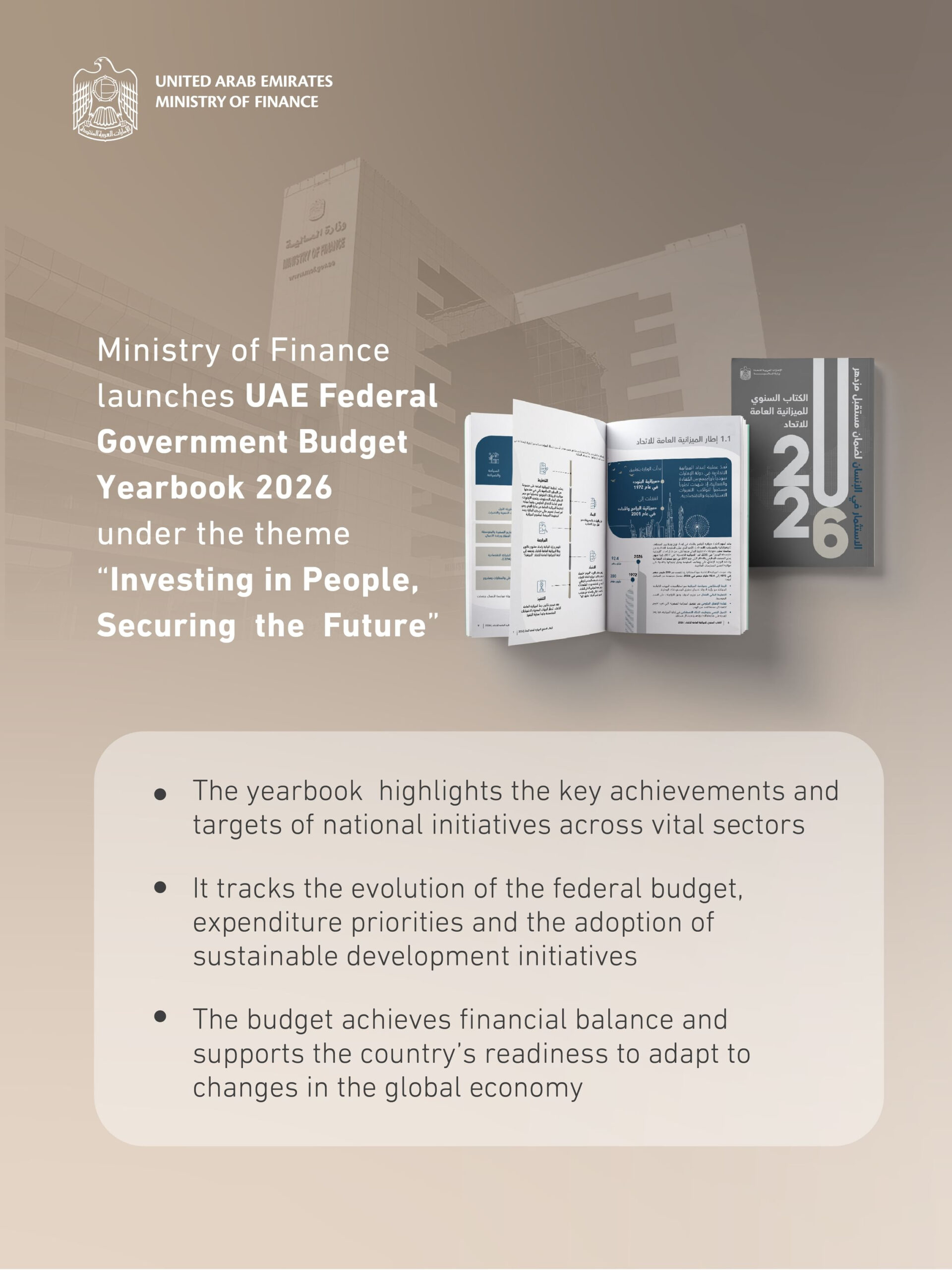 The UAE Ministry of Finance (MoF) has launched the Federal Budget Yearbook 2026 under the theme ‘Investing in People, Securing the Future’. The yearbook presents a human-centred vision that places individuals at the heart of development planning, reaffirming the strength of the UAE’s financial system and its continued ability to support national development efficiently despite