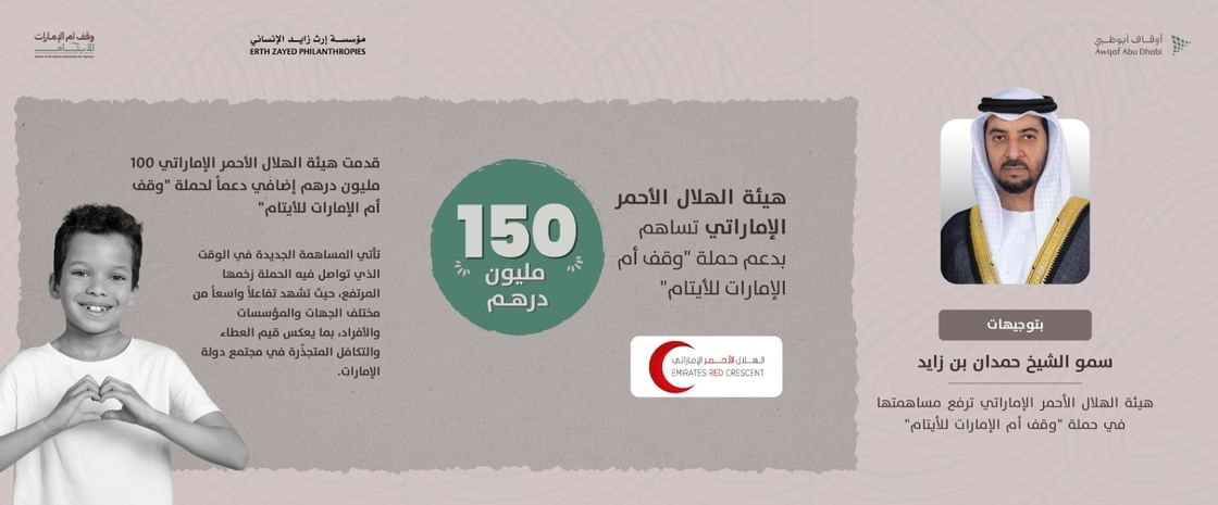 Under the directives of H.H. Sheikh Hamdan bin Zayed Al Nahyan, Ruler’s Representative in Al Dhafra Region and Chairman of the Emirates Red Crescent (ERC), the Authority has announced that it has raised its contribution to reach AED150 million in support of the Mother of the Nation Endowment for Orphans initiative, launched under the patronage