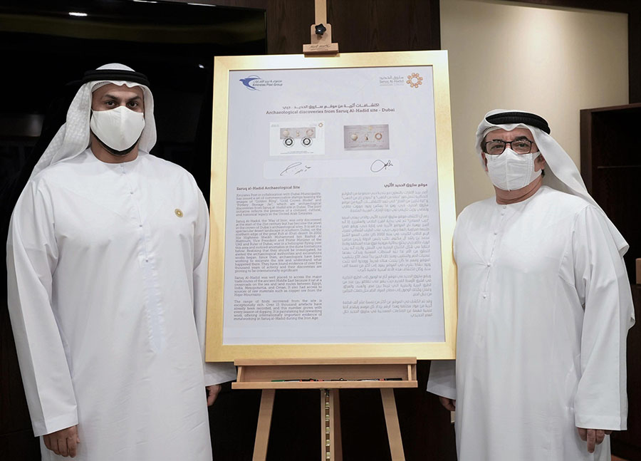 Emirates Post Group,in cooperation with Dubai Municipality, issued a set of commemorative stamps featuring the Saruq Al Hadid archaeological site in Dubai, one of the most important archaeological discoveries in the UAE. The stamps bear images of a “Golden Ring”, “Gold Crown Model”, and “Pottery Storage Jar”, all of which represent the most prominent unearthed