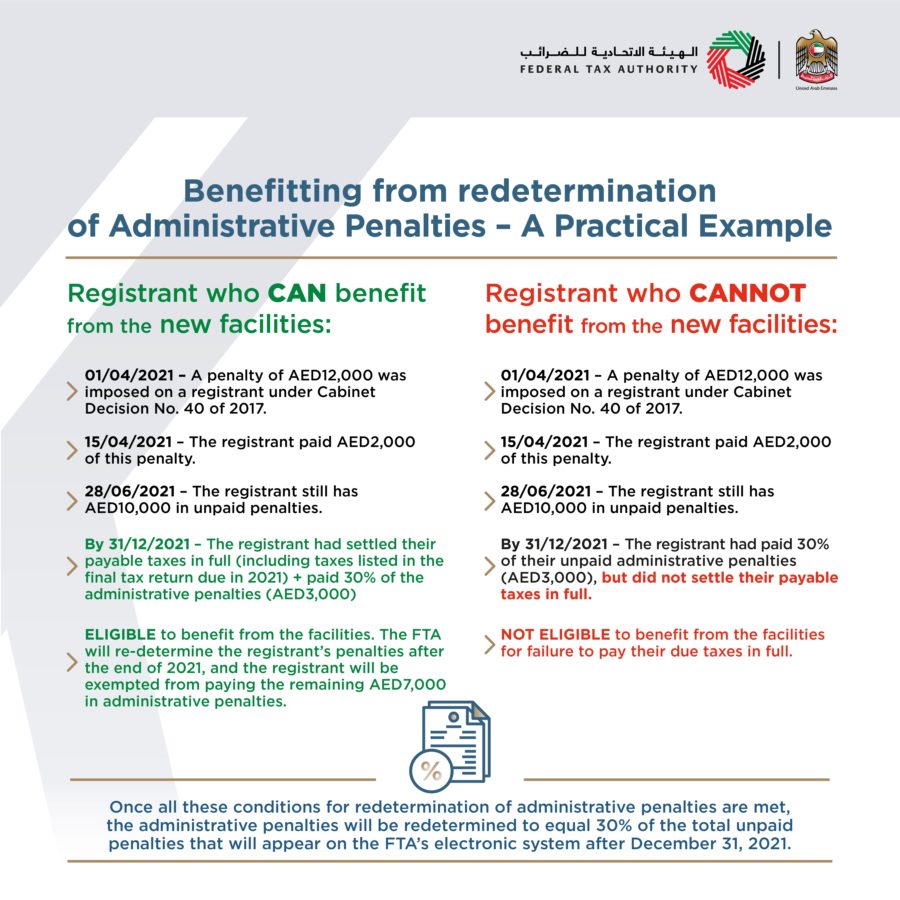 The Federal Tax Authority (“FTA”) has called again for registrants to benefit from Cabinet Decision No. 49 of 2021 on Amending Provisions of Cabinet Decision No. 40 of 2017 on the Administrative Penalties for Violation of Tax Laws in the UAE. The Decision came into effect on June 28, 2021, and includes reductions on administrative