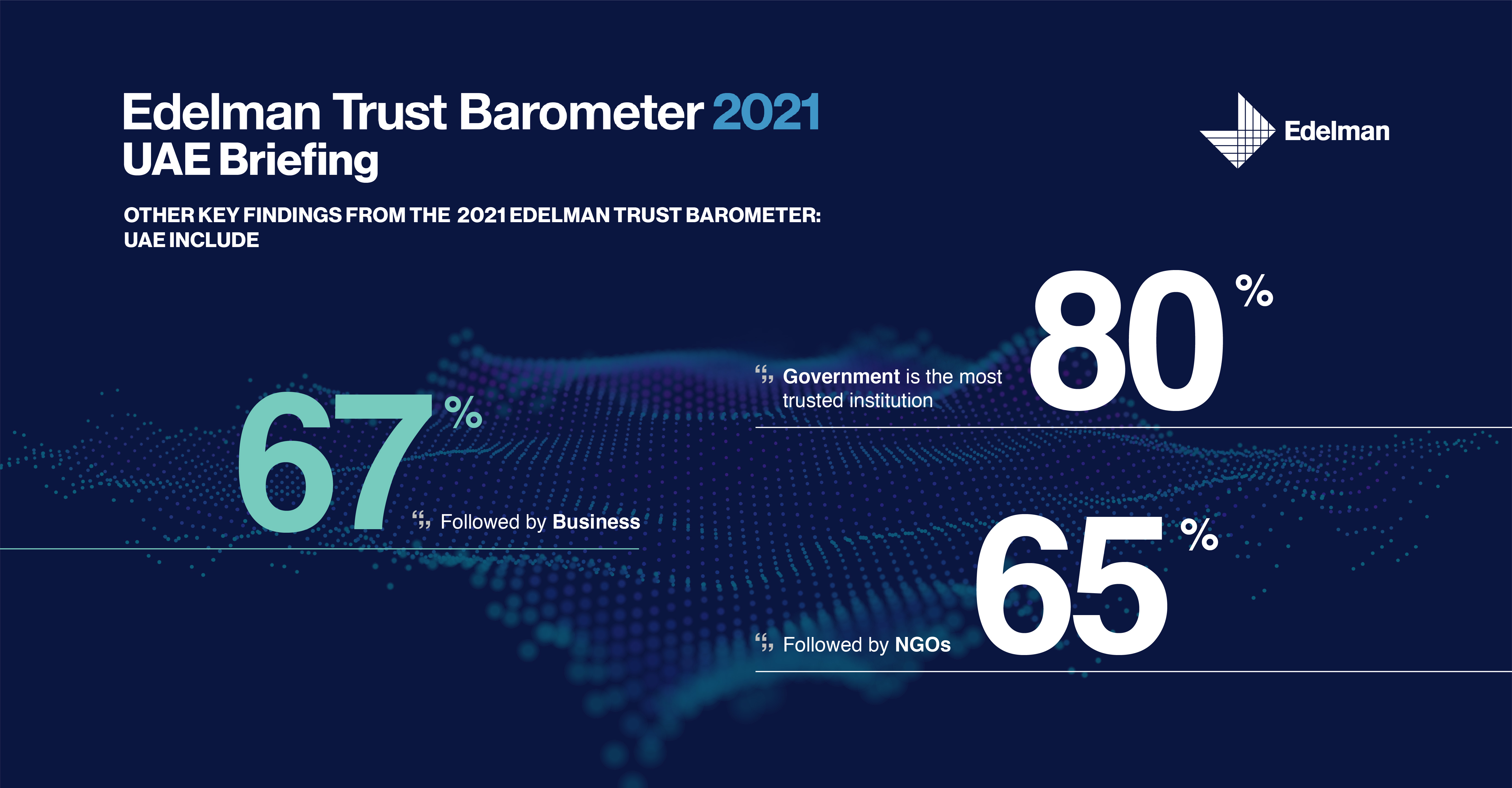 The 2021 Edelman Trust Barometer reveals strong trust in the UAE’s leadership, with Government emerging once again as the most trusted institution, at 80 per cent, and a double-digit lead over Business and NGOs. This represents a four-point increase since last year and reinforces the UAE’s position as one of the most trusted governments in