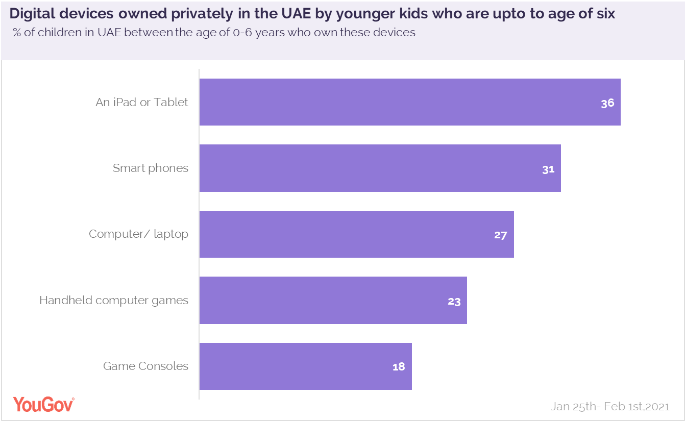 Young kids up to age six are more likely to own a separate device than use an adult’s or share among siblings YouGov’s latest research shows more than a third (36%) of young children in the UAE, up to the age of 6 years, possess their own iPad or tablet. The survey questioned parents on
